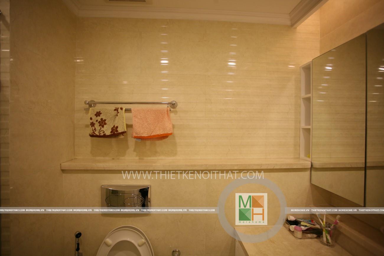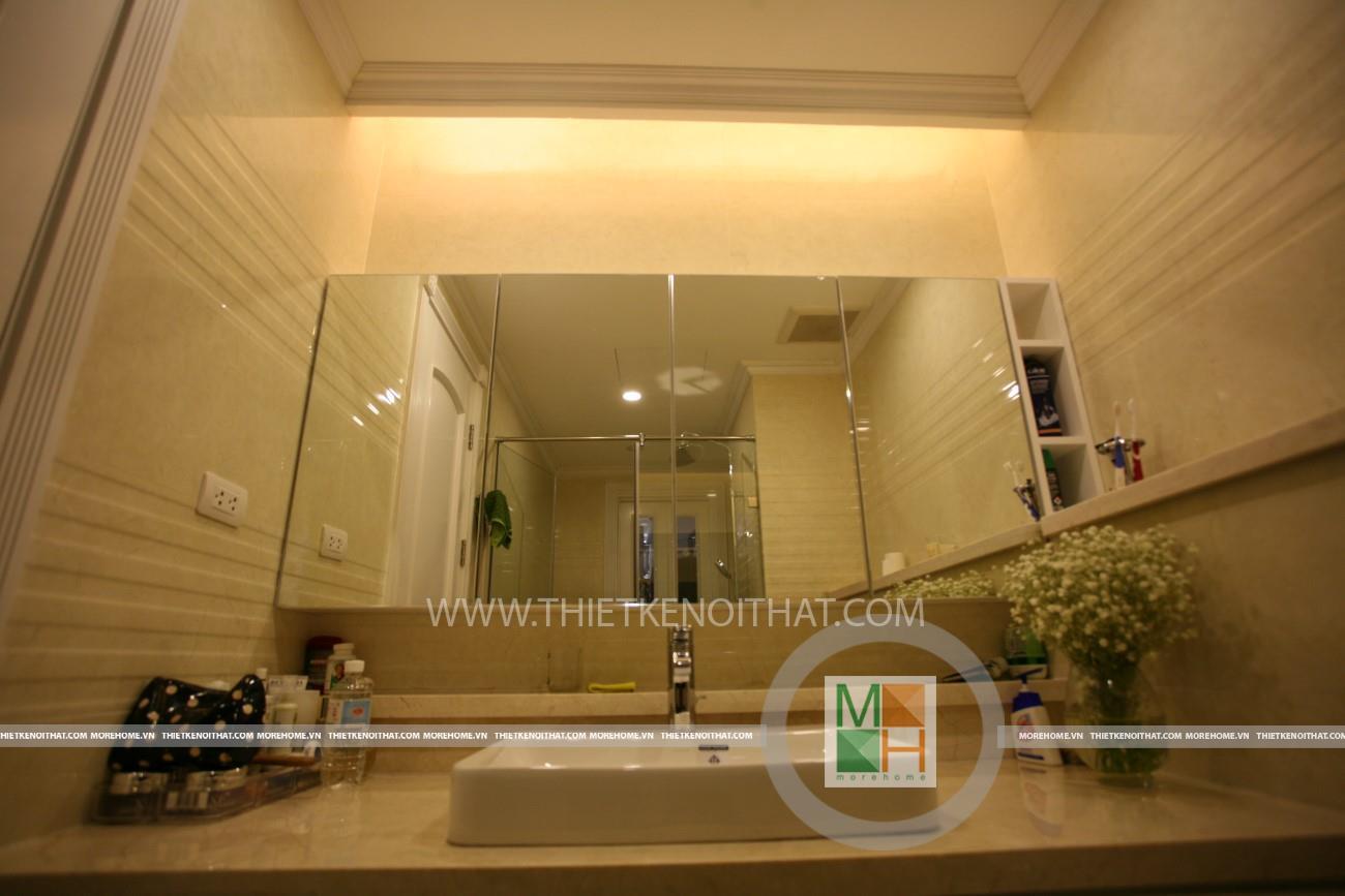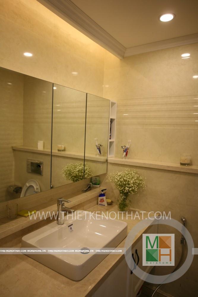 Không chỉ dừng lại ở phòng bếp, phòng vệ sinh cũng được chú trọng trong từng đường nét thiết kế. Các kiến trúc sư của Morehome đã tận dụng một cách sáng tạo những chi tiết nhỏ từ chậu rửa, kệ rửa, gương một cách tinh tế nhất để tạo nên một không gian sang trọng cho toàn bộ căn hộ.