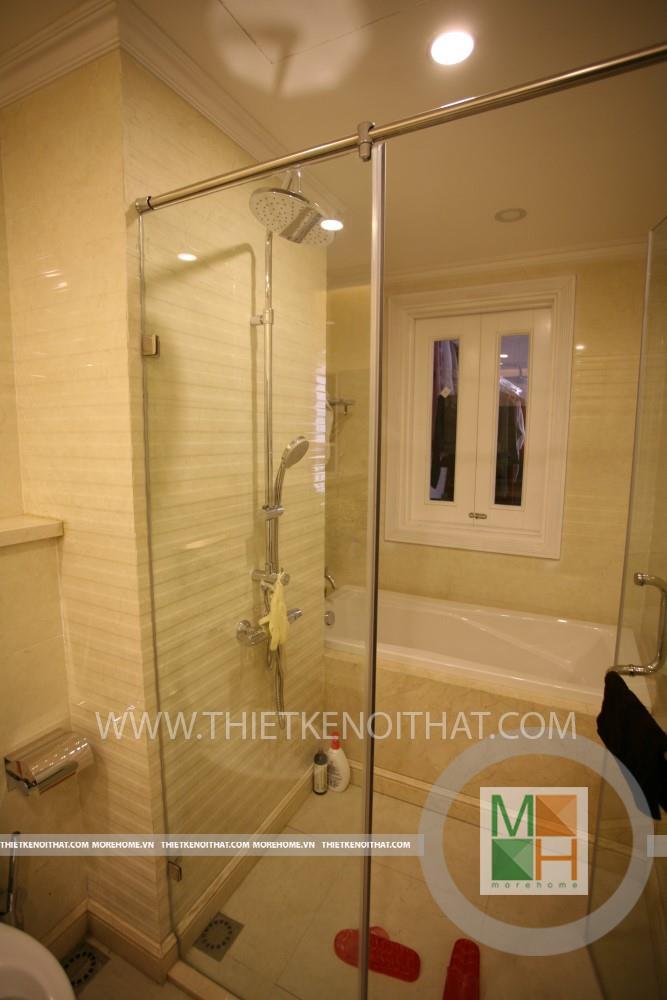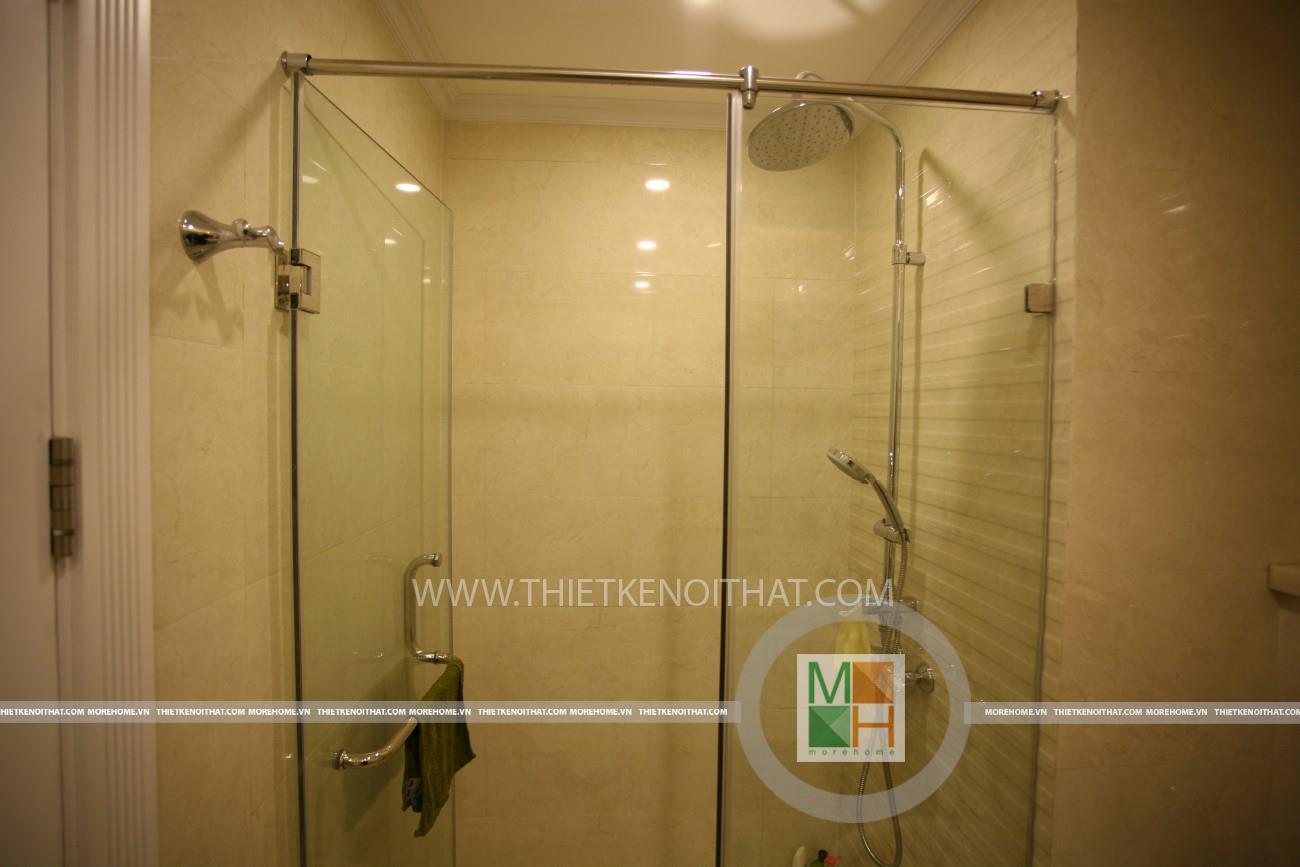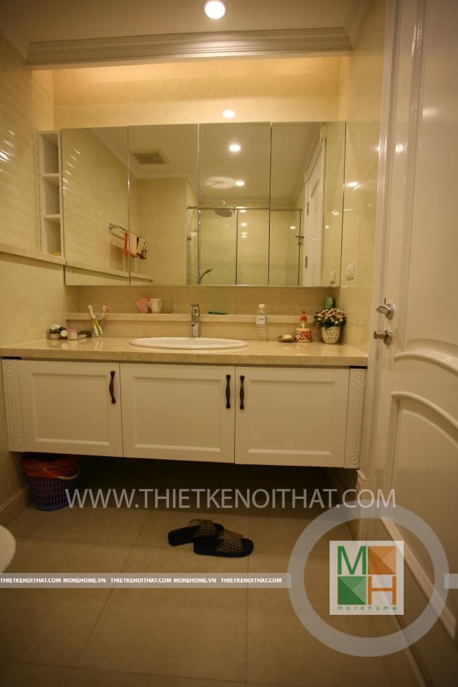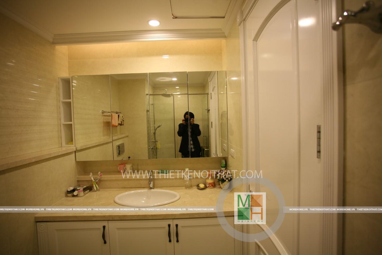 Không chỉ dừng lại ở phòng bếp, phòng vệ sinh cũng được chú trọng trong từng đường nét thiết kế. Các kiến trúc sư của Morehome đã tận dụng một cách sáng tạo những chi tiết nhỏ từ chậu rửa, kệ rửa, gương một cách tinh tế nhất để tạo nên một không gian sang trọng cho toàn bộ căn hộ.