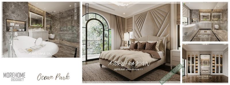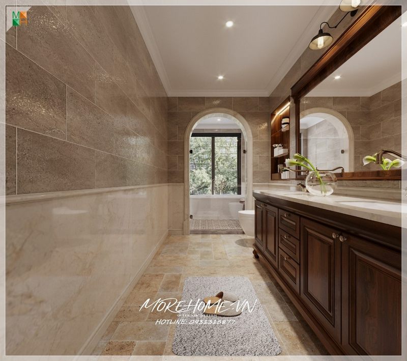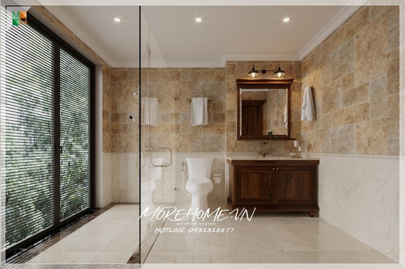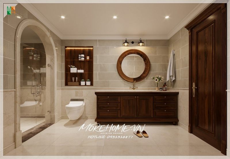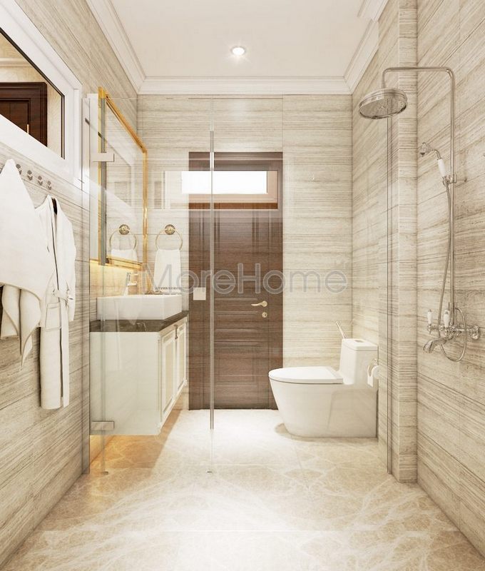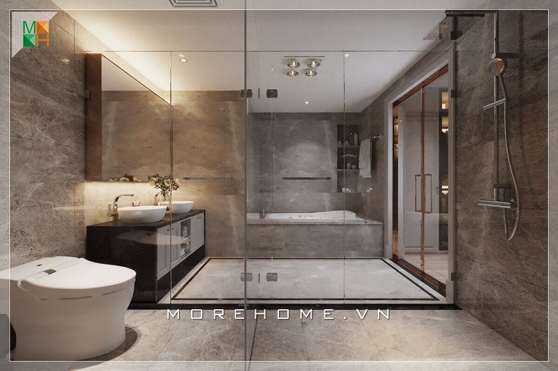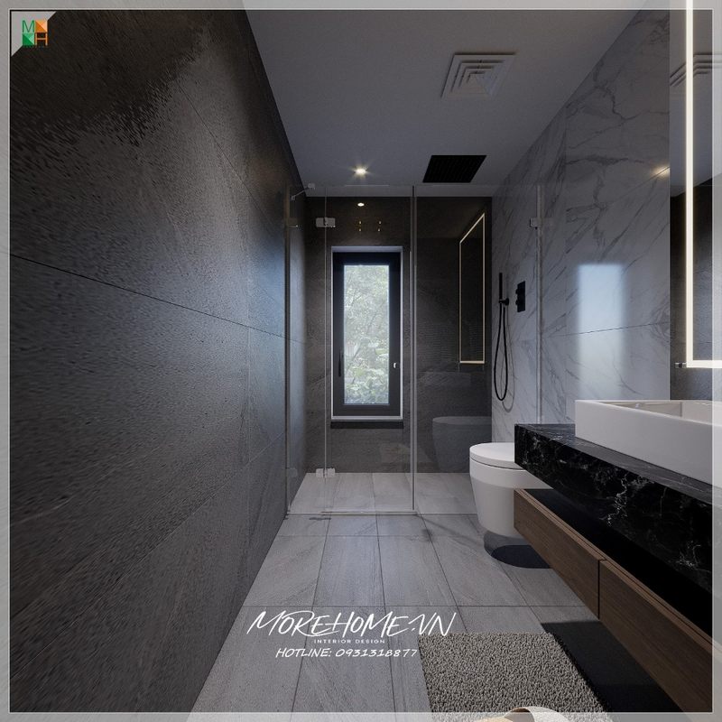 Để tránh sự nhàm chán khi sử dụng tông trắng làm chủ đạo, KTS Morehome đã khéo léo kết hợp gạch ốp tường và gạch lát sàn phòng tắm màu tối để tạo điểm nhấn, kết hợp vách kính tắm cường lực 2 bên giúp tạo sự liên kết trong không gian ngôi nhà