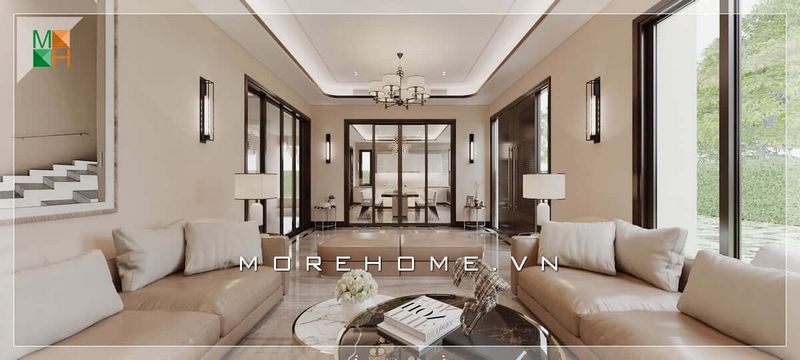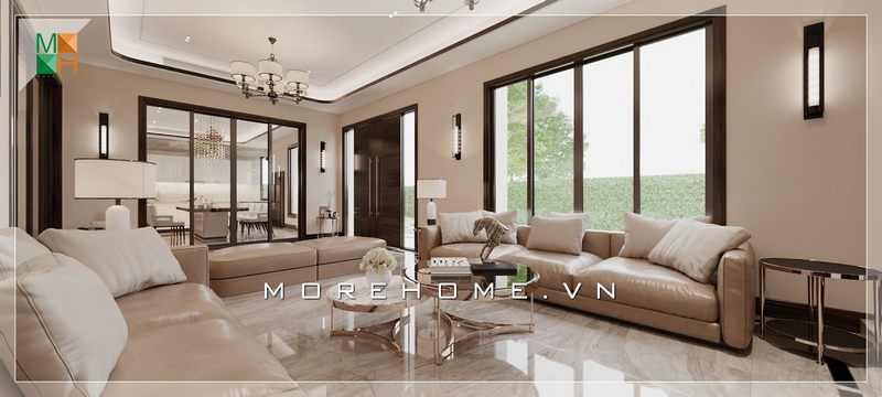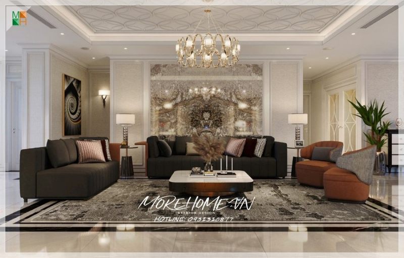 Không gian phòng khách tân cổ điển được thiết kế theo phong cách tân cổ điển không quá nổi bật về mặt công năng nhưng mang lại ấn tượng sâu sắc cho gia chủ