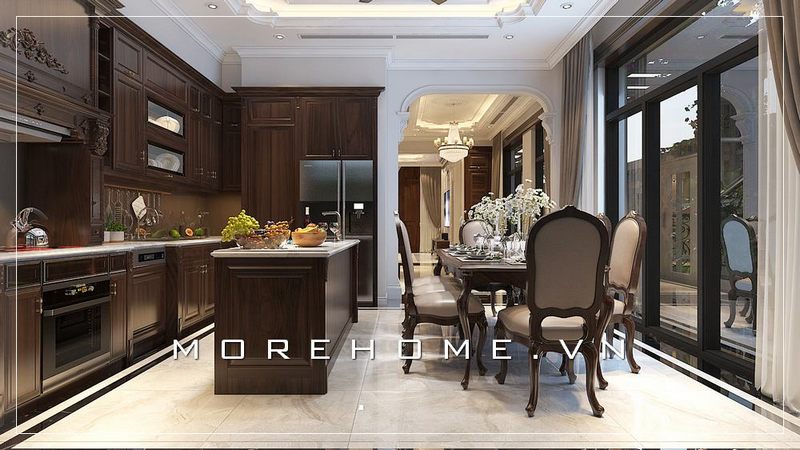 . Mẫu tủ bếp gỗ óc chó cao cấp có thiết kế đường nét hoa văn tân cổ điển tinh tế, tạo ra không gian phòng bếp ấn tượng khi kết hợp với các thiết bị bếp hiện đại giúp người nội trợ có được sự tiện nghi.